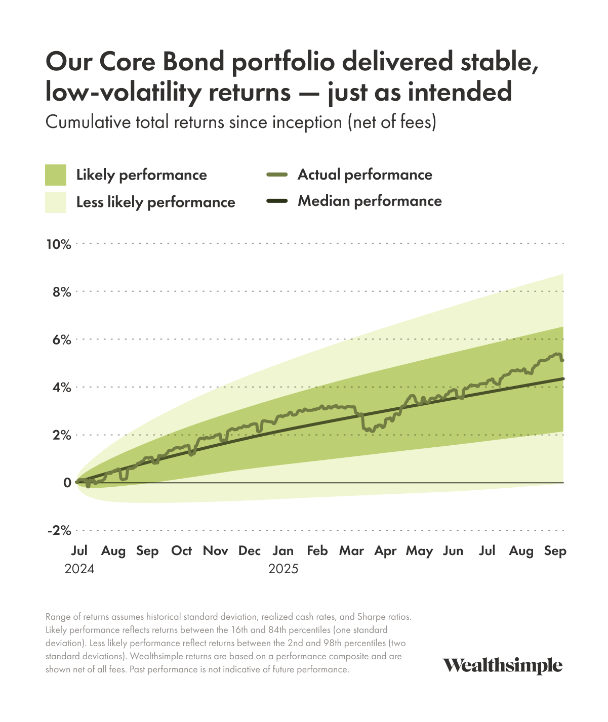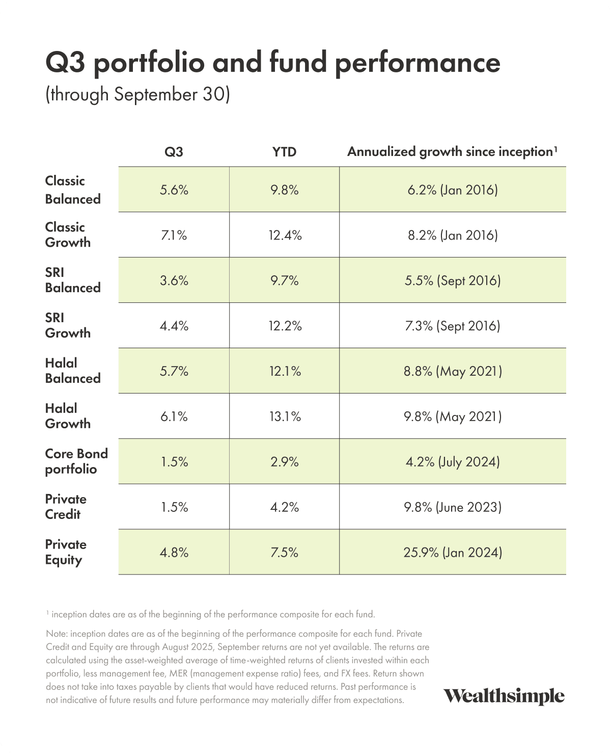 When we launched our Core bond portfolio in July 2024, we designed it for investors who wanted to invest in something that would outperform a high-interest savings account but was lower volatility than our stock portfolios. So far the portfolio is meeting our expectations on both fronts. In Q3, the portfolio returned 1.5%, bringing the total returns since launch to 5.5%. Its yield to maturity, or the expected returns you’d get by holding the portfolio’s mix of securities over any time period, is currently 3.7%, which is roughly 1% above the rates for our Money market portfolio.